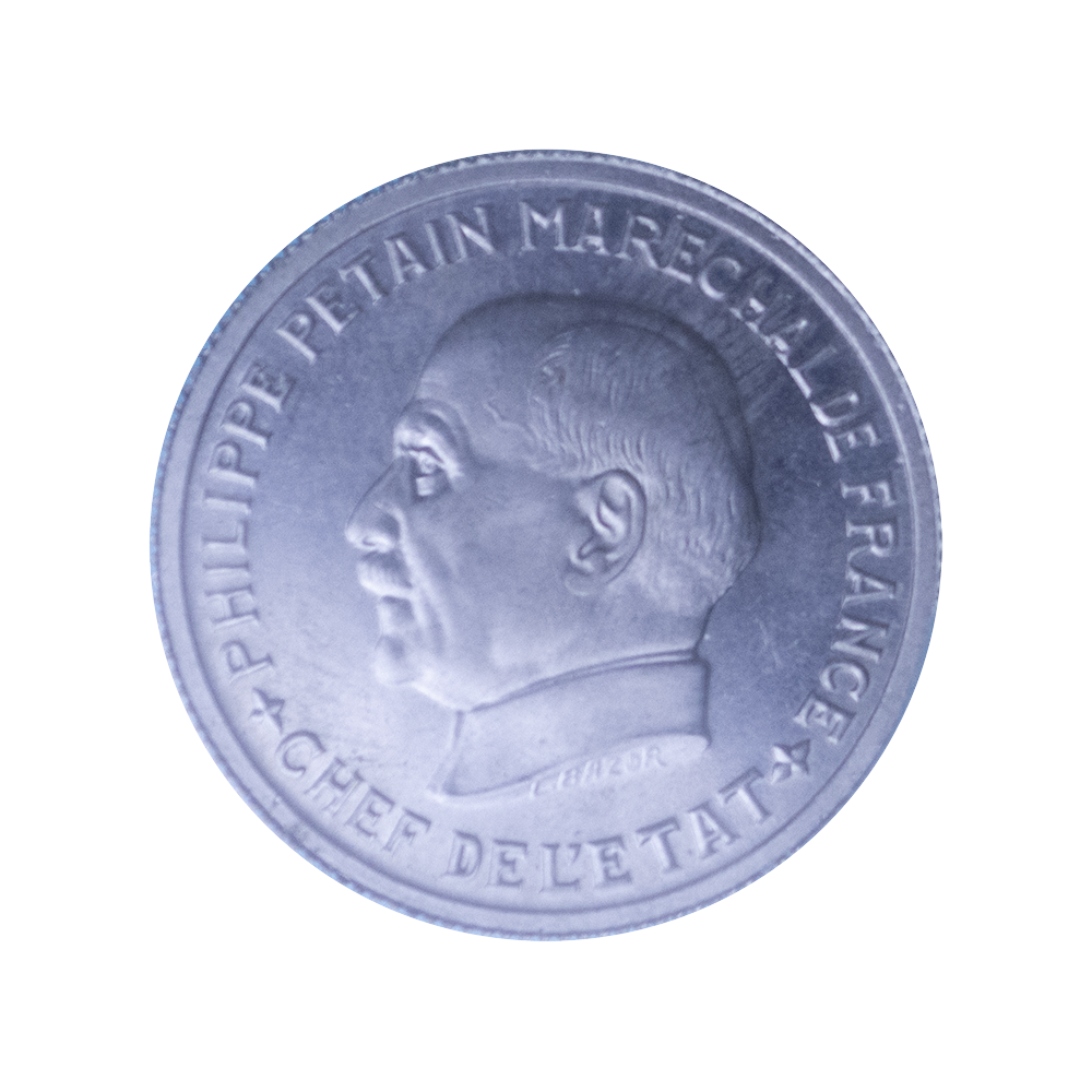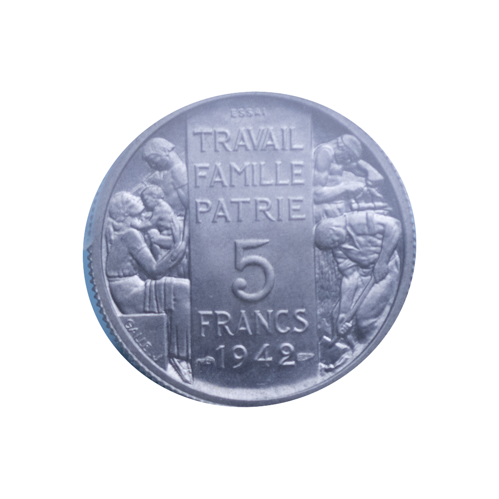 Légende : ESSAI/ TRAVAIL/ FAMILLE/ PATRIE/ 5/ FRANCS/ 1942// GALLE . J.