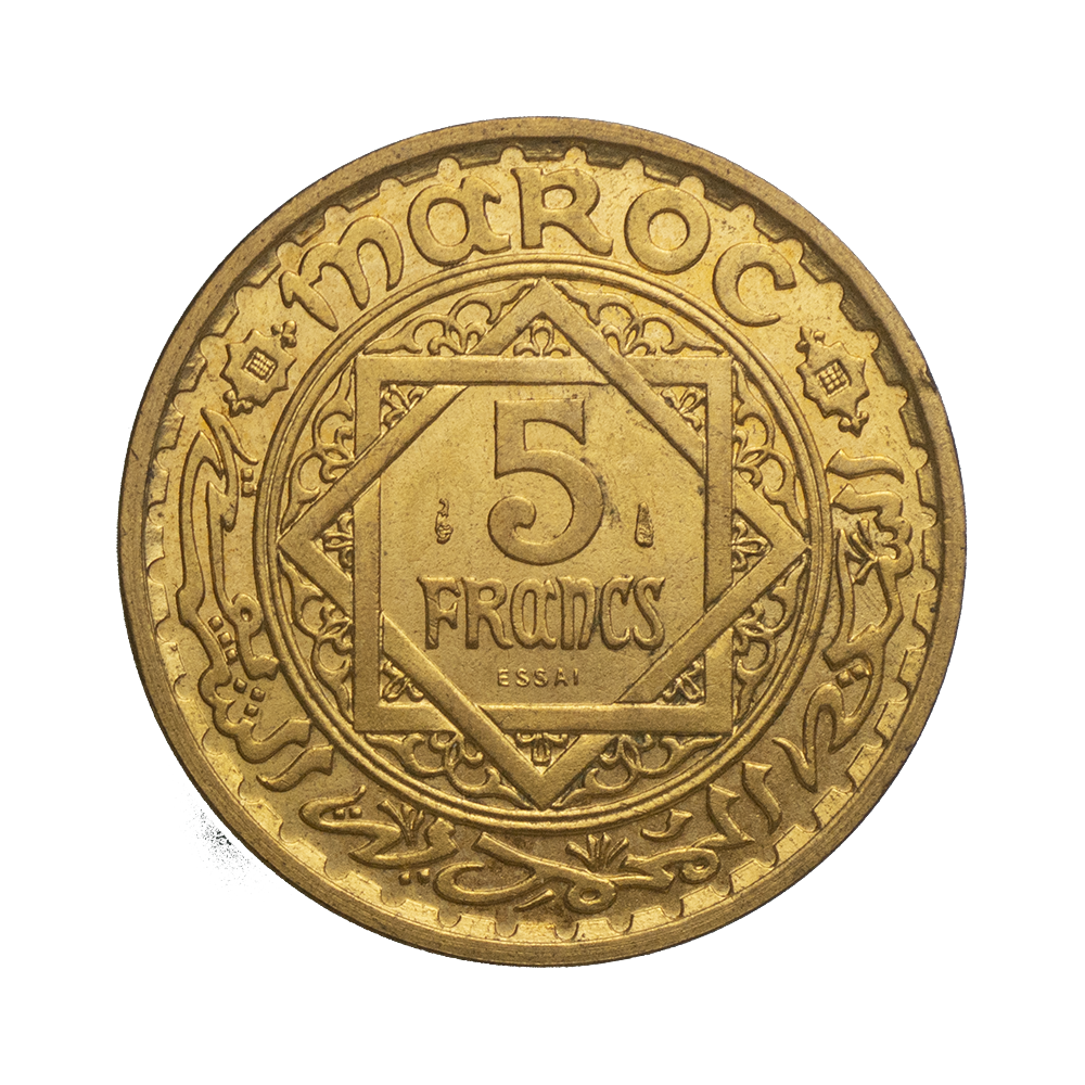 Légende : EN FRANÇAIS ET ARABE : MAROC / 5 / FRANCS / ESSAI / FRAPPE DE LA NOBLE DYNASTIE ISSUE DE MAHOMET.