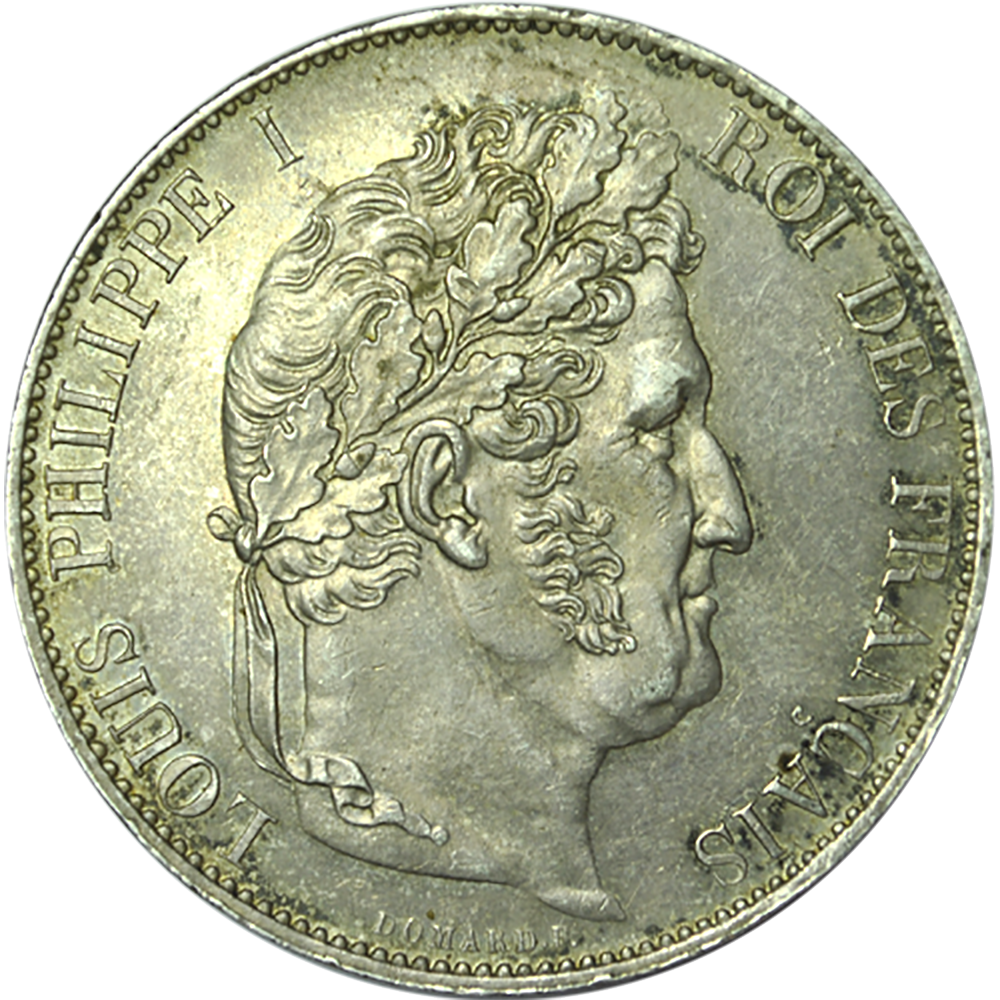 5 FRANCS sur deux lignes, au-dessus du millésime 1845, le tout dans une couronne nouée par un ruban à sa base, formée à gauche d'une branche de laurier, à droite d'une branche d'olivier ; au-dessous du noeud le différent de Graveur Général encadré du différent de Charles-Louis DIERICKX à gauche et de la lettre d'atelier W à droite.