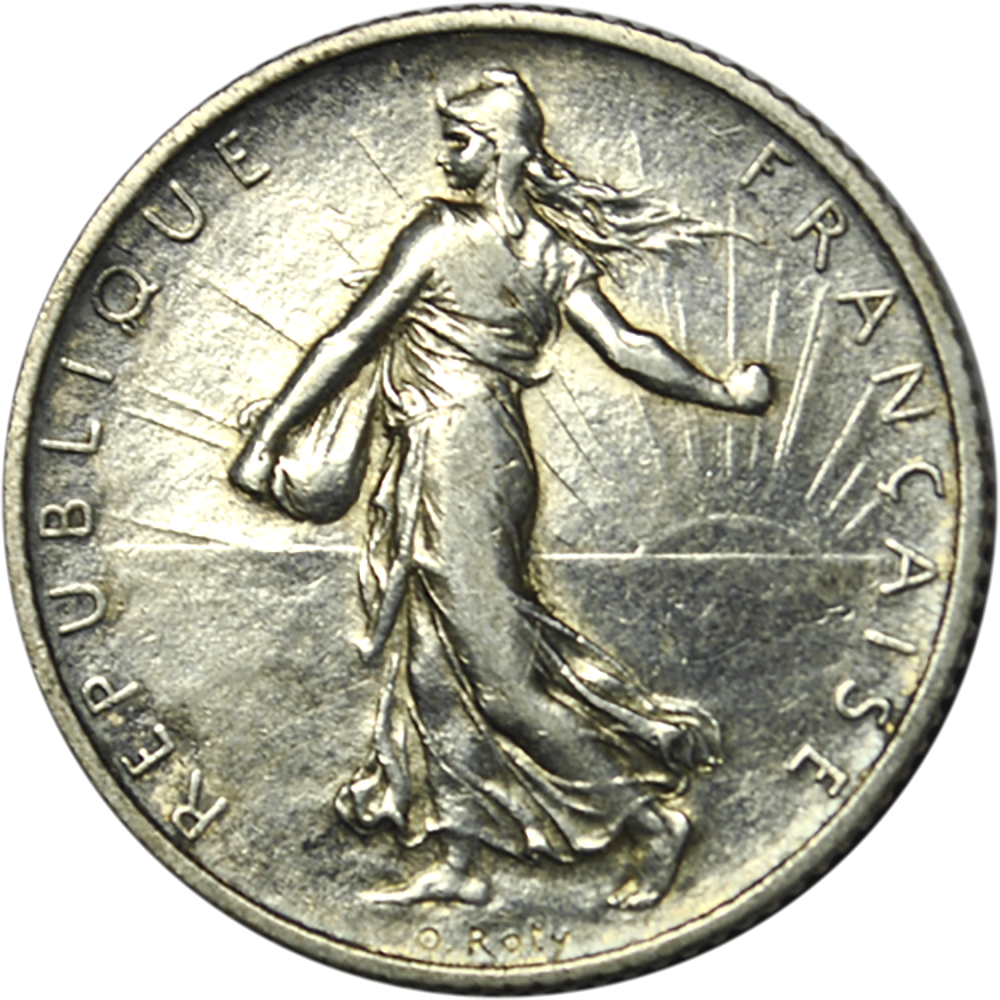 Description : La République à gauche, sous les traits d'une semeuse drapée et coiffée d'un bonnet phrygien, aux cheveux longs, marchant et semant à contre-vent ; en arrière-plan, derrière la semeuse à droite, un solei levant ; au-dessous, en creux O*ROTY.