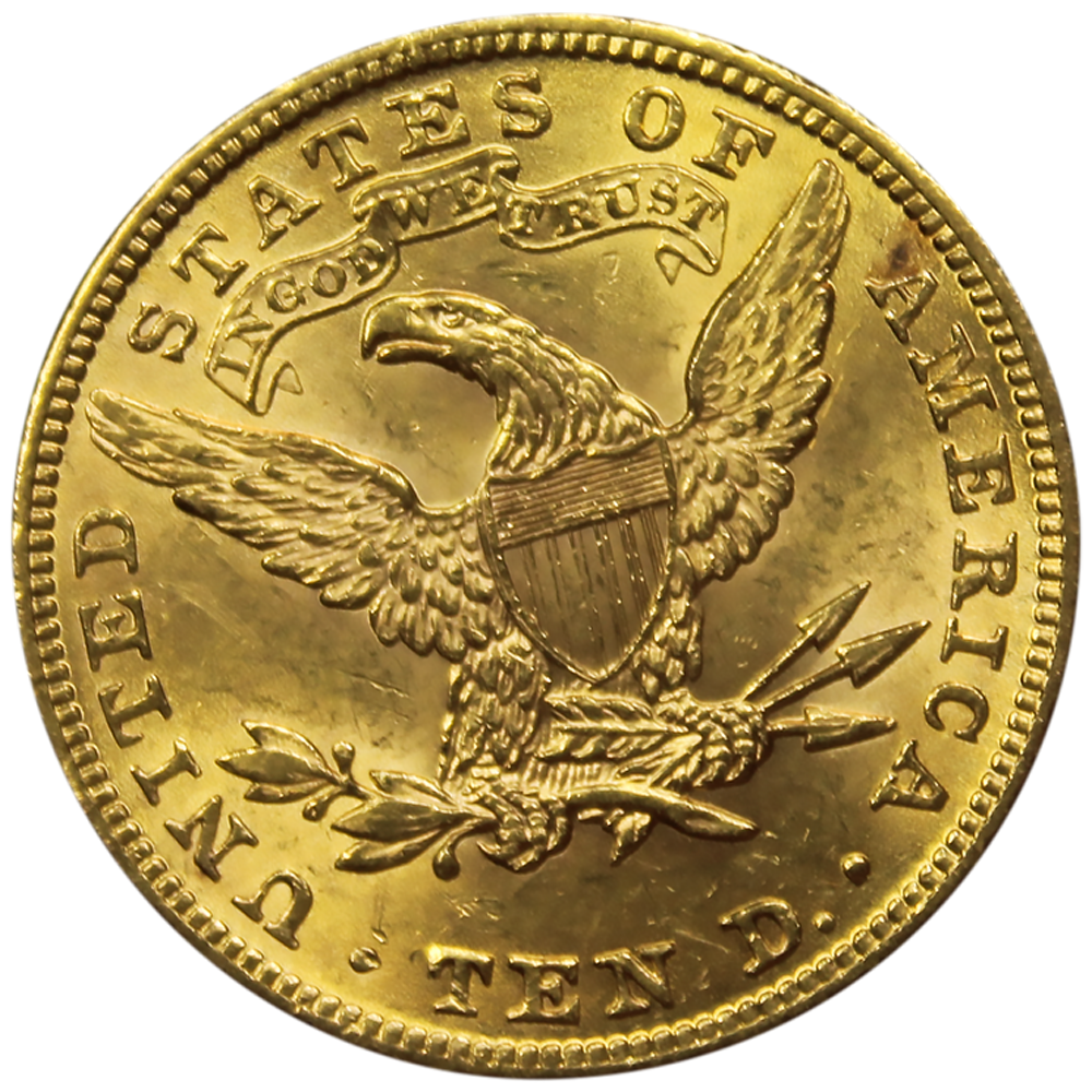 Les pièces de 10 Dollars US Liberty, qui ont été frappées de 1838 à 1866, ne disposent pas de la devise "IN GOD WE TRUST". En 1866, le revers a été modifié par l'ajout de la devise sur un ruban, au-dessus de l'aigle.