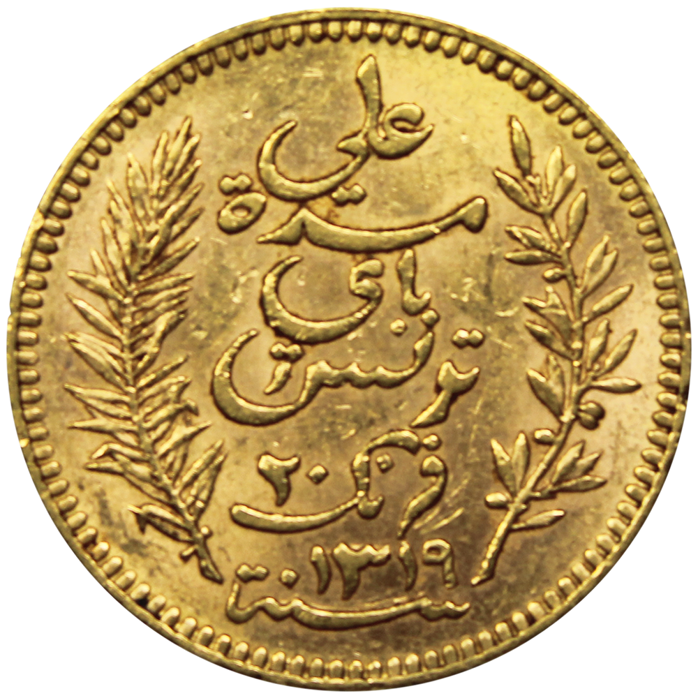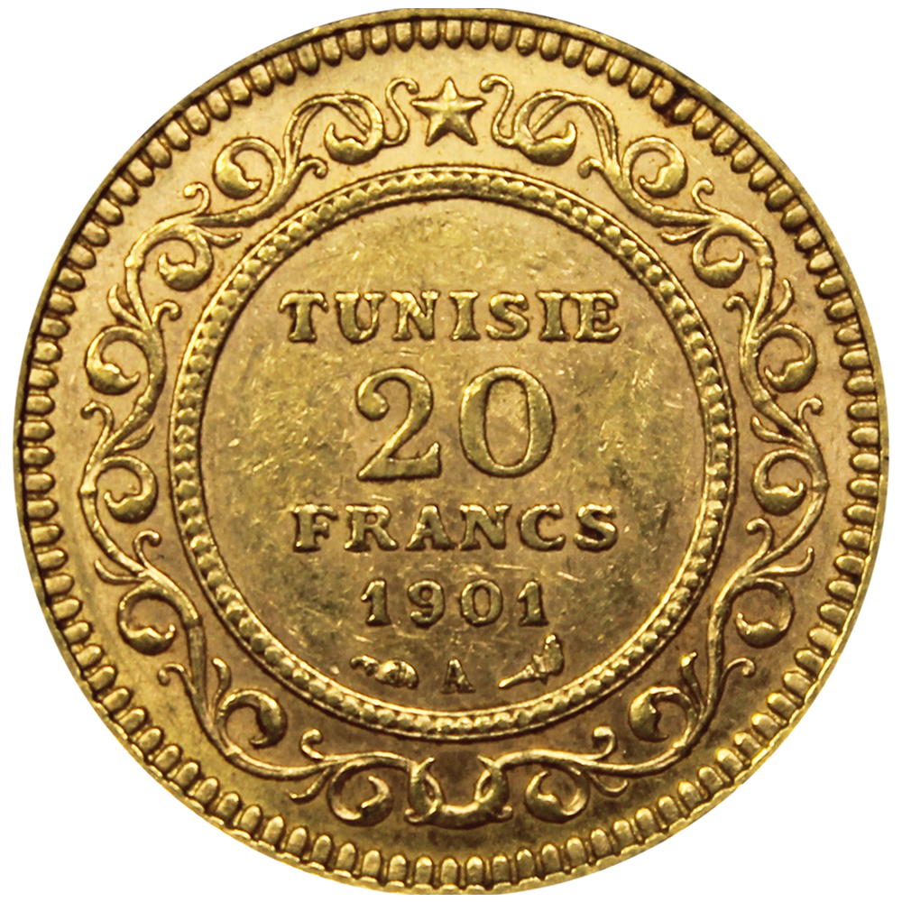 Après l’établissement du protectorat (Traité du Bardo, 1881), la Tunisie se dote d’un monnayage aligné sur les normes françaises. La valeur de 20 francs en or est introduite dans les années 1890, sur le standard commun de l’Union latine : mêmes poids et titre que la pièce française, pour faciliter les échanges et l’interopérabilité au sein de l’espace monétaire européen de l’époque.