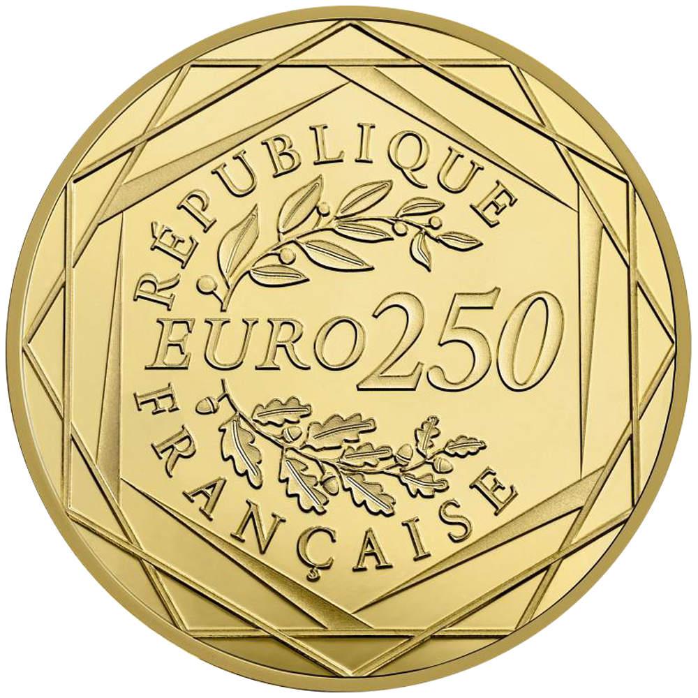 AVERS : Nous retrouvons inscrit sur l'avers de la pièce: RÉPUBLIQUE FRANÇAISE ainsi que sa valeur faciale (EURO 250) entourée de deux branches, l'une de chêne, l'autre de laurier, qui évoquent le sigle de l'Euro.