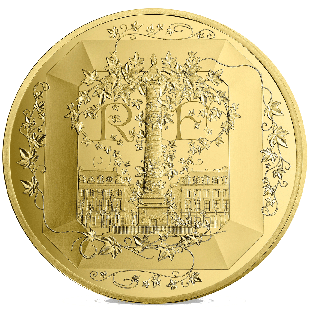 La face de cette monnaie met en avant la place Vendôme encadrée par une évocation d’une taille émeraude. La vue de cette place est orientée de façon a ce que la célèbre colonne soit mise en avant. Les feuilles de lierre gravissent cette dernière, symbolisant une nature triomphante. Les lettres RF sont entourées des feuilles de lierre sur la partie centrale haute de la pièce.