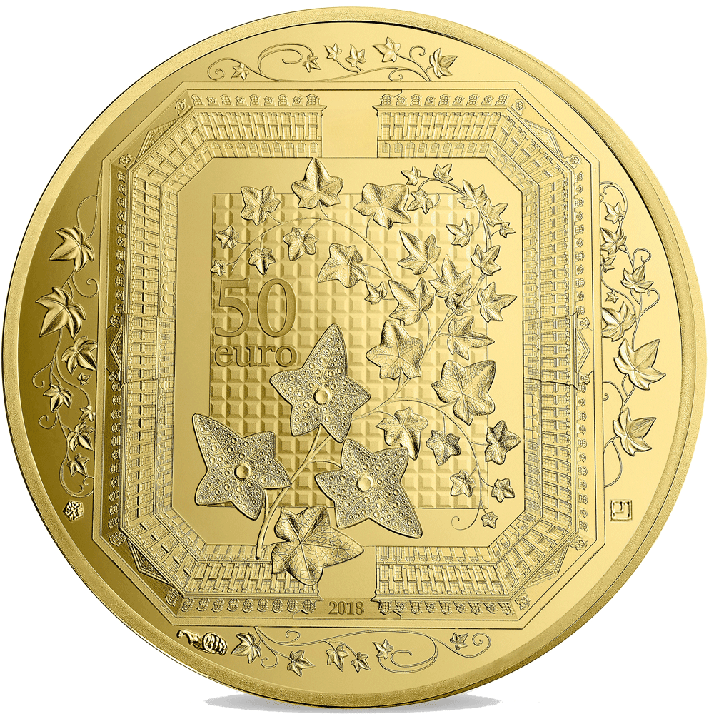 Le revers de cette pièce représente une vue aérienne de la place Vendôme. De cette place émerge une nature triomphante magnifiée par des feuilles de lierres dont les nervures ornées de dessins de petits diamants sont apparentes. Ces feuilles de lierre donnent l’impression de venir à nous. La valeur faciale de la pièce est visible sur la partie centrale de la pièce, côté gauche.