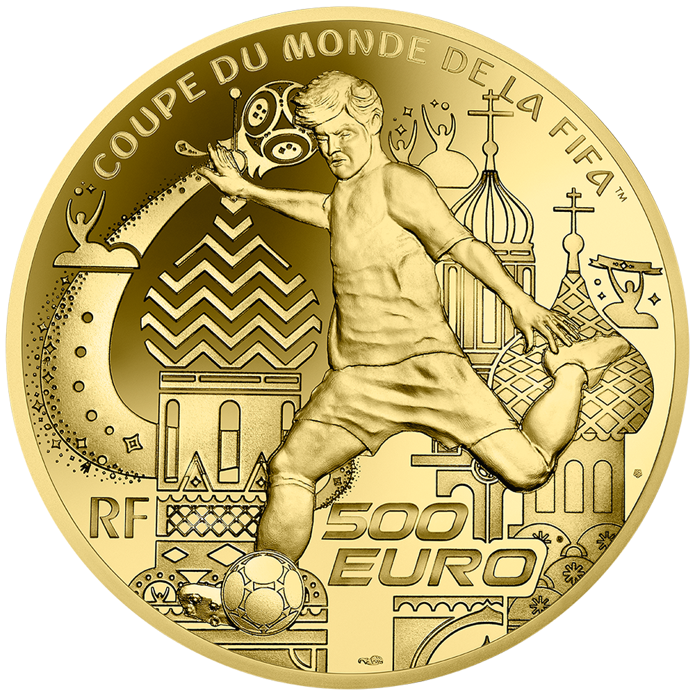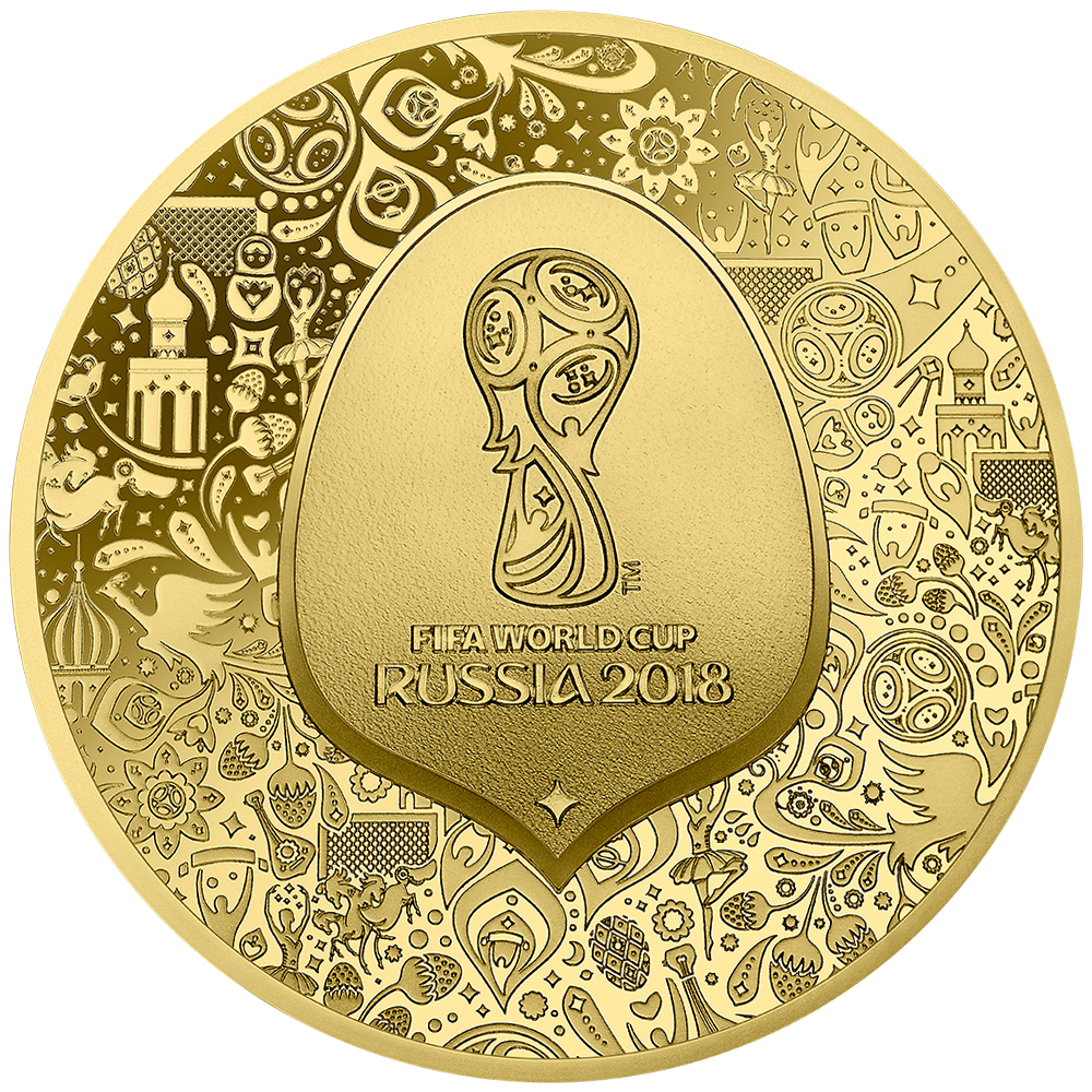 AVERS : La face représente le trophée et le nom de la compétition, insérés dans un all-over de symboles évoquant à la fois le football et la culture russe.