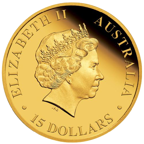Y sont inscrits: ELIZABETH II, AUSTRALIA ainsi que la valeur faciale 15 dollars de la pièce.