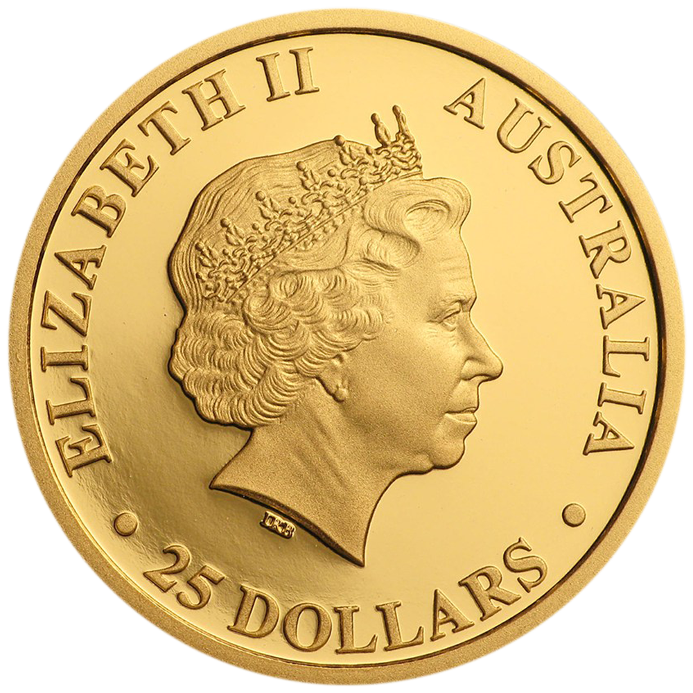 Y sont inscrits: ELIZABETH II, AUSTRALIA ainsi que la valeur faciale 25 dollars de la pièce.