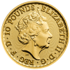Le recto de la pièce en or Britannia 1/10 once comprend les inscriptions ELIZABETH II DEI GRATIA REGINA F D (FIDEI DEFENSOR) ainsi que la valeur faciale.