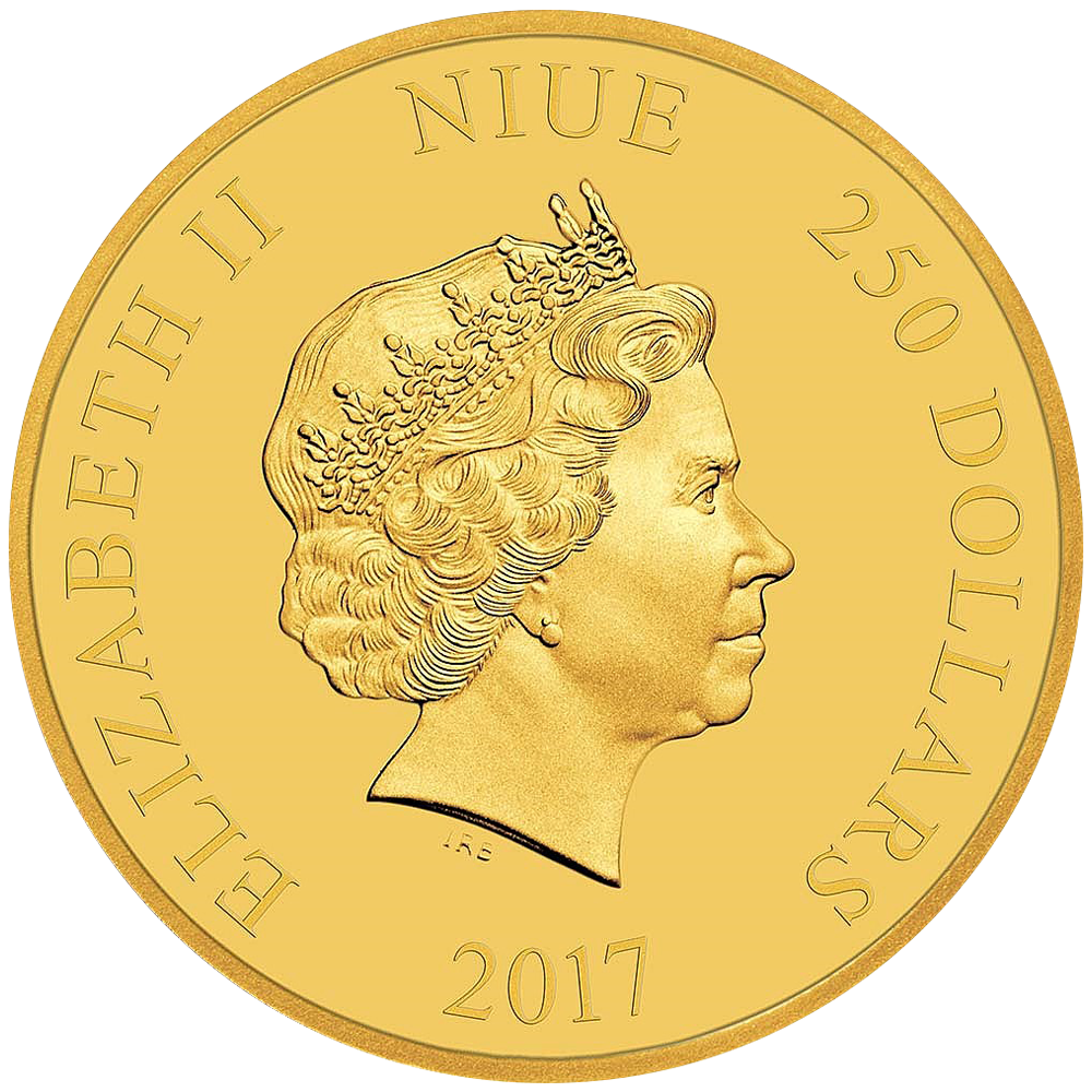 Y apparait, son nom "ELIZABETH II" en haut suivi de "NIUE" ainsi que la valeur faciale "250 DOLLARS" et le millésime de la pièce 2017.