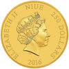 Y apparait, son nom "ELIZABETH II" en haut suivi de "NIUE" ainsi que la valeur faciale "250 DOLLARS" et le millésime de la pièce 2016.