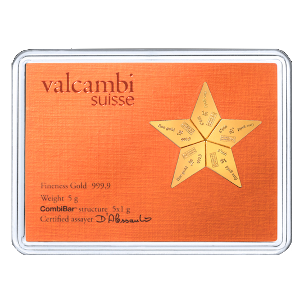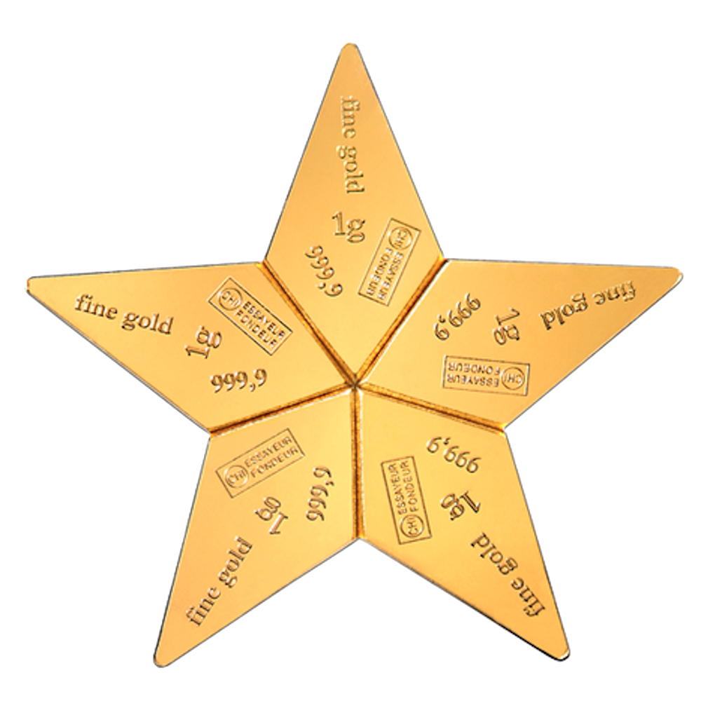 Ces lingotins Combibar 5g peuvent prendre plusieurs formes : classique avec son format A8 en plaquette ou en étoile, comme récemment proposé par l'essayeur Valcambi.