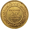 Après l’établissement du protectorat (Traité du Bardo, 1881), la Tunisie se dote d’un monnayage aligné sur les normes françaises. La valeur de 20 francs en or est introduite dans les années 1890, sur le standard commun de l’Union latine : mêmes poids et titre que la pièce française, pour faciliter les échanges et l’interopérabilité au sein de l’espace monétaire européen de l’époque.