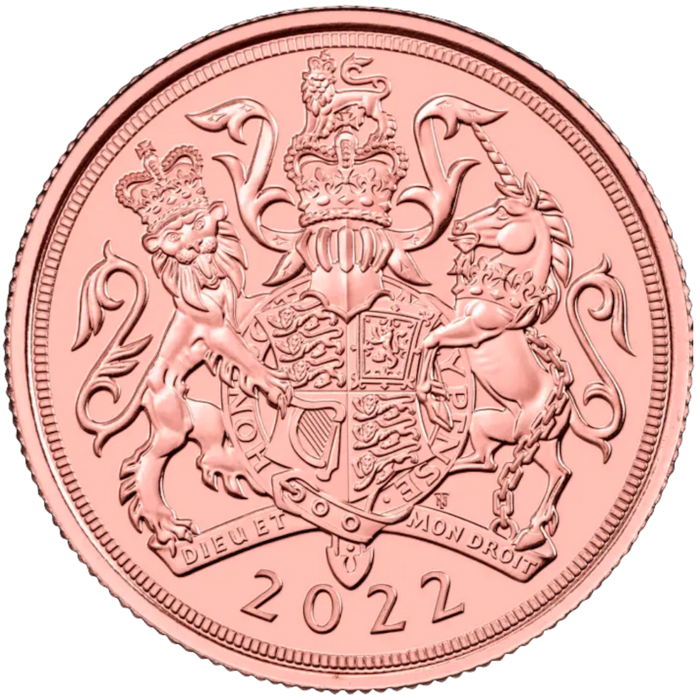 La pièce 2022 abandonne le dessin classique de Pistrucci au revers de la pièce au profit d'une magnifique interprétation des armoiries royales par Timothy Noad.