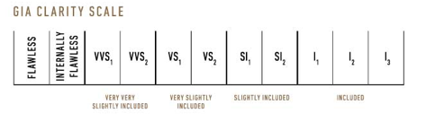 Cette échelle va aller de F ( Flawless soit pur à l’intérieur et parfait à l’extérieur) à I1, I2 et I3 (Imperfect soit inclus ou très inclus avec des inclusions facilement visibles à l’œil nu), en passant par IF (Internally Flawless soit pur à l’intérieur), VVS1 et VVS2 (Very Very Slightly Included soit très très peu inclus et les inclusions sont très difficile à voir à la loupe 10X), VS1 et VS2 (Very Slightly Included soit très peu inclus avec des inclusions difficiles à voir à la loupe 10X), SI1 et SI2 (Slightly Included soit peu inclus avec des inclusions facilement visibles à la loupe 10X).